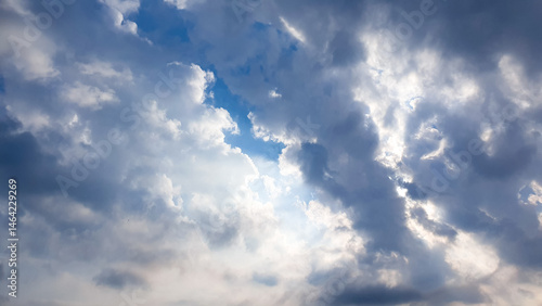© Binkontan, Obraz premium Blue sky with clouds and sunshine. Sky landscape on the horizon with clouds.