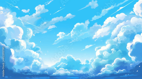 Fototapeta premium Blue sky with clouds. Anime style background with shining sun and white fluffy clouds. Heaven's with bright weather, summer season outdoor. Generative AI.
