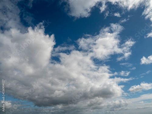 © mark_gusev, Obraz premium Blue sky with fluffy clouds of different shapes. Nature background for design and sky replacement.
