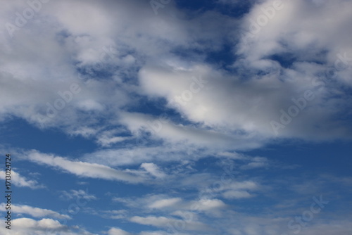 Obraz premium Blue sky with fluffy white clouds Bright blue sky with soft white clouds,...