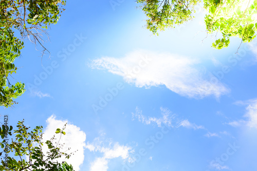 Obraz premium Blue sky with green leaves frame background.