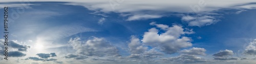 © hiv360, Obraz premium blue sky with haze in 360 hdri panorama in equirectangular format with zenith and clouds and sun for use in 3d graphics or game development as skydome or edit drone panoramas or sky replacement