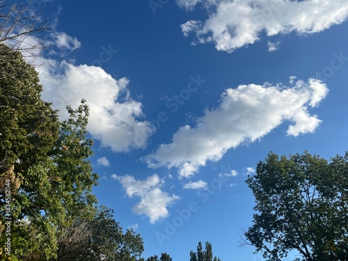 Fototapeta premium Blue Sky with White Clouds and Green Trees