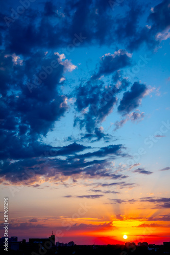 © Roman_23203, Naklejka premium Blue sky with white clouds at sunset, town in the distance
