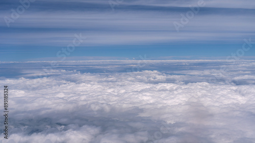 Obraz premium Blue Sky with White Clouds, Flying above Sunny Cloudy Sky Texture Pattern, Fluffy Clouds Plane View