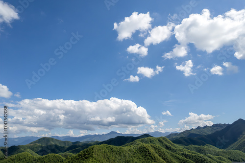 © zhouyilu, Fototapeta premium Blue Sky with White Clouds Over Green Mountain Ranges