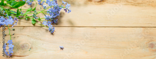 © Ольга Симонова, Naklejka premium Blue small forget-me-nots flowers on a wooden background. The concept of eco style, natural texture. Space for text. Flatlay