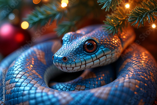 Fototapeta premium Blue snake with red eyes coiled around a Christmas tree branch, set against a...