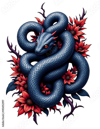 © dreamscapeimages, Obraz premium Blue Snake with Red Flowers, Transparent Background
