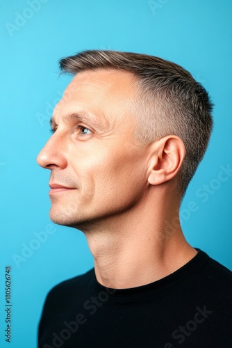 © R, Obraz premium Blue solid background. A relaxed and poised man showing grace. F