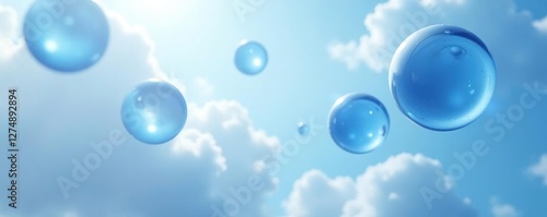 Fototapeta premium Blue spheres drifting through a white cloudy sky, flarium, blue bubbles,...