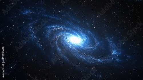 Fototapeta premium Blue spiral galaxy with bright core and stars in cosmic space.