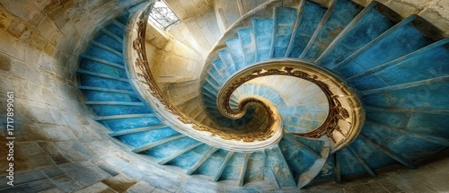 Fototapeta premium Blue spiral staircase architectural detail vintage interior design whirl curve ascent