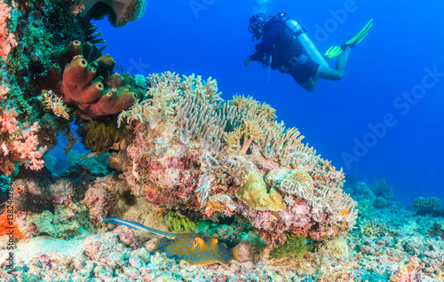 © whitcomberd, Naklejka premium Blue Spotted Stingray and SCUBA diver