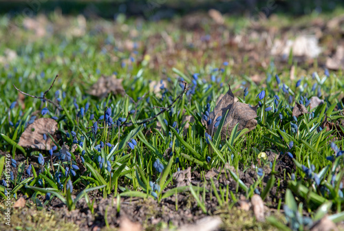 © FO_DE, Obraz premium Blue spring primroses on the bare ground.