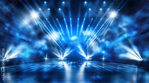 Obraz premium Blue stage lights illuminate an empty performance space.