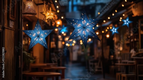 © fatih, Obraz premium Blue star lanterns illuminate night market alley
