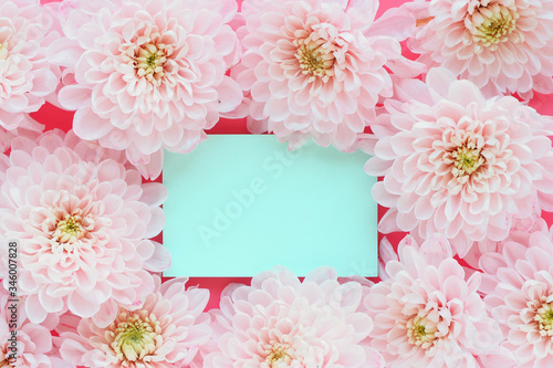 Obraz premium .Blue sticker on a pink background and pink chrysanthemum flowers. Space for...