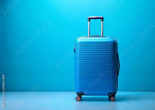 Obraz premium Blue suitcase is standing against turquoise background. A realistic shadow is...