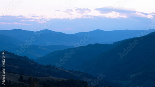 © liusan , Fototapeta premium Blue sunset with the setting sun behind the mountains