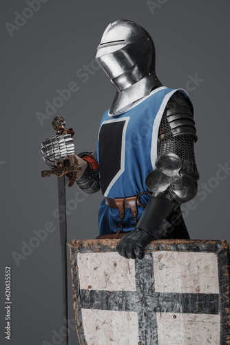 © Fxquadro, Naklejka premium Blue surcoat-wearing medieval knight with sword and shield on gray background