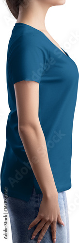 © olegphotor, Fototapeta premium Blue t-shirt mockup with pocket, v-neck on girl, png, side view