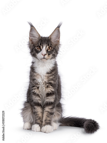 © Nynke, Obraz premium Blue tabby Maine Coon cat kitten, sitting up facing front. Looking towards camera. Isolated on a white background.