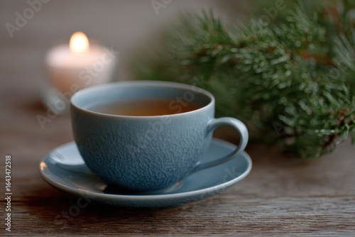 © Mind, Fototapeta premium Blue teacup on saucer with lit candle and pine branch nearby