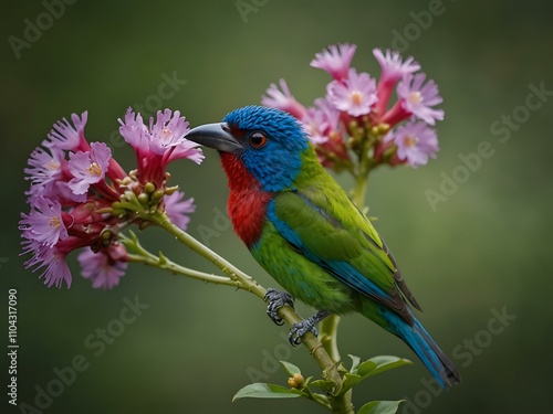 © claudunia, Fototapeta premium Blue-throated barbet perched on a blooming flower plant.