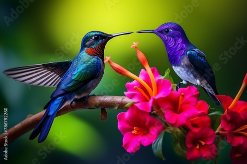 © Creative Laik, Fototapeta premium Blue-throated Hummingbird in flight with flowers in the background