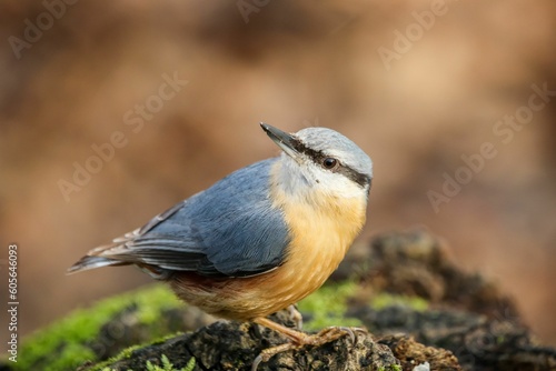 © Woodhicker_shots1/Wirestock Creators, Naklejka premium Blue tilt perching on a wood with blurred background