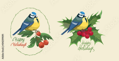 Obraz premium Blue tit and holly leaves and berries, cartoon vector bird illustration and...