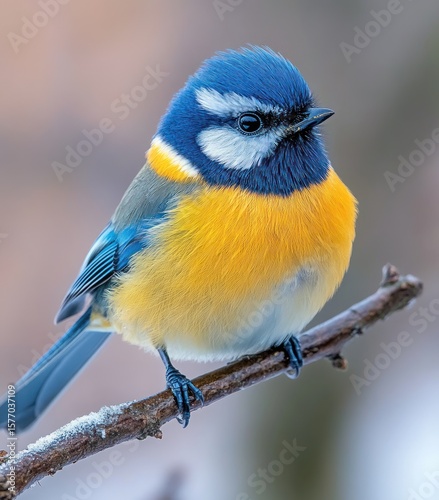 © matoya, Obraz premium Blue tit bird perched on branch in winter. Possible use Nature photography
