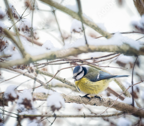 Naklejka premium Blue tit bird sitting on a snow covered tree