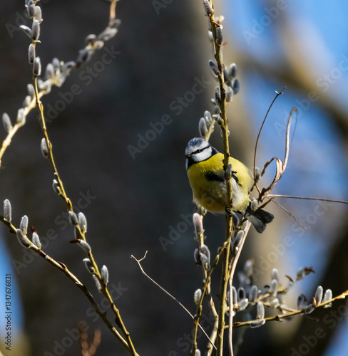 © Sammy, Obraz premium Blue Tit (Cyanistes caeruleus) Among Spring Blossoms – Birdwatching Photography, Easter