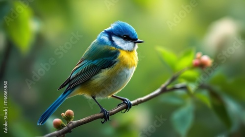 © Adisorn, Fototapeta premium Blue tit, garden tilt-shift, a miniature wonder.
