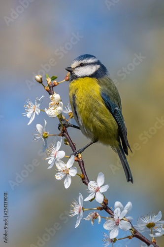 © Tomasz, Obraz premium Blue tit (Parus caeruleus) on blackthorn blossom in beautiful sunny day.