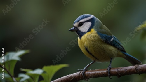Obraz premium Blue tit perched on a branch, showing vibrant plumage against a blurred green...