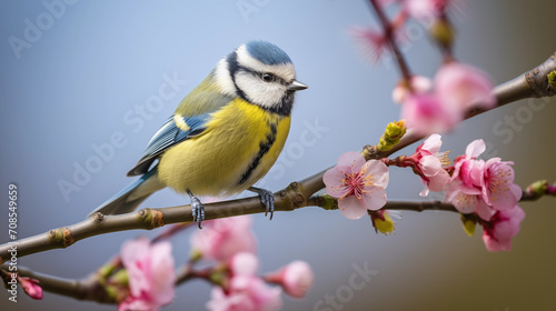 Naklejka premium blue tit sitting on a branch with spring blossoms
