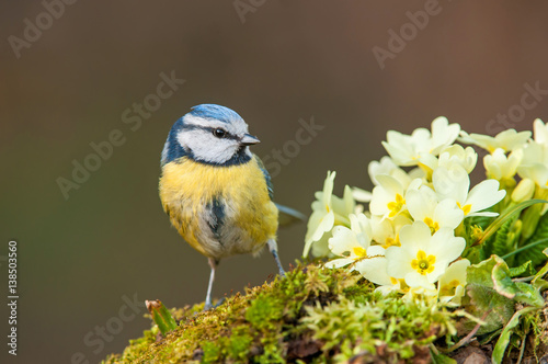 © Soru Epotok, Naklejka premium Blue tit, standing next to primroses