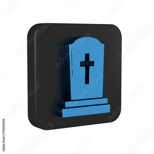 Obraz premium Blue Tombstone with cross icon isolated on transparent background. Grave icon. Black square button.