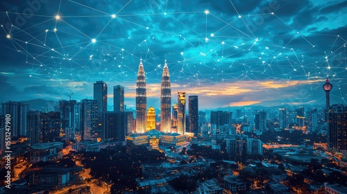 © Yultoms95, Fototapeta premium Blue tone Kuala Lumpur cityscape and network connection concept. Sunbeam effect.