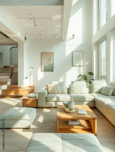 Fototapeta premium blue tone Stylish interior design living room modern mint sofa wooden consol