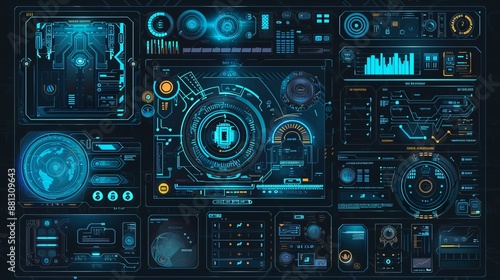 Fototapeta premium Blue-toned futuristic digital dashboard featuring diverse interface elements,...