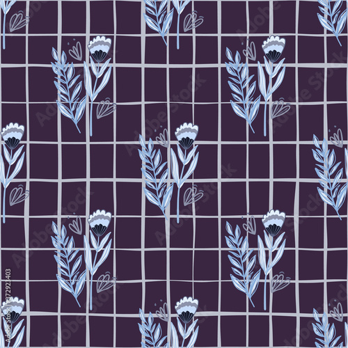 Fototapeta premium Blue tones outline floral ornament with forest elements seamless pattern. Branches and flowers on chequered background.