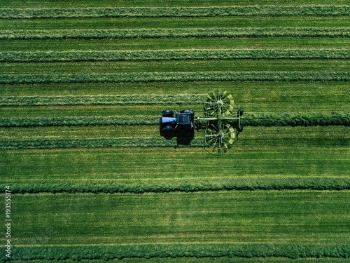 © nblxer, Fototapeta premium Blue tractor mowing green field, aerial view