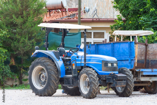 © aapsky, Fototapeta premium Blue tractor parked next to a rural house.