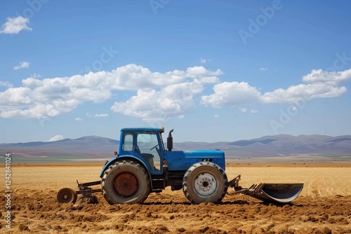 © Natasha , Obraz premium Blue tractor plowing a field under a clear sky in rural countryside.