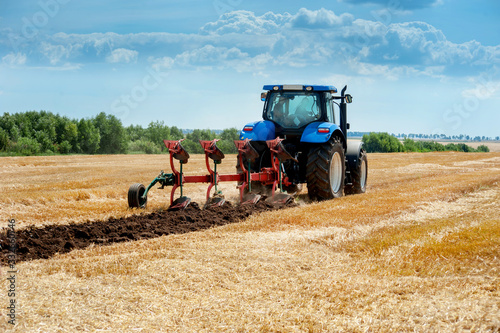 © pavlobaliukh, Obraz premium blue tractor pulls plow, arable land, field preparation