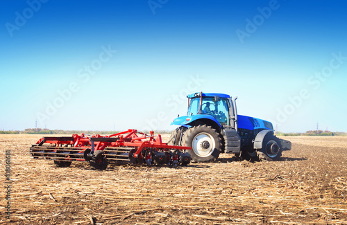 © murika, Obraz premium Blue tractor working in an open field